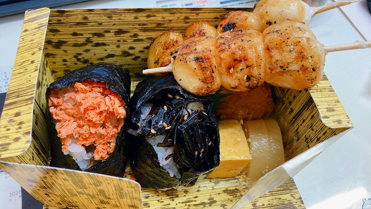 毎年のお楽しみ団子。おにぎり弁当を添えて。